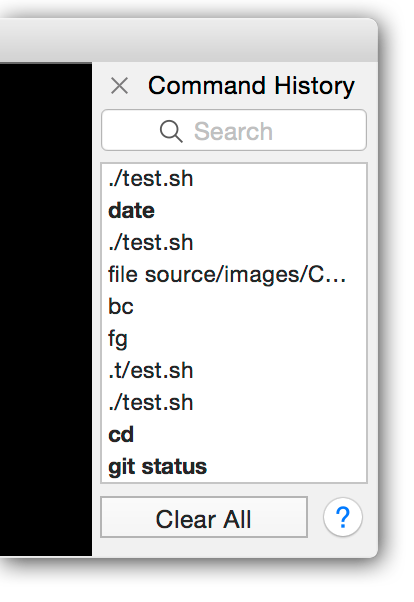 Bold commands are from the current session. Clicking on one will scroll to reveal it. Double-clicking enters the command for you. Option-double-clicking will output a "cd" command to go to the directory you were in when it was last run.