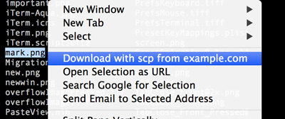 If you drop a file (e.g., from Finder) into iTerm2 while holding the option key, iTerm2 will offer to upload the file via scp to the remote host into the directory you were in on the line you dropped the file on. A new menu bar item will be added called Uploads that lets you view uploaded files and track their progress.